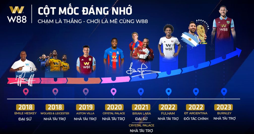 Tháng 2 2018 – Emile Heskey công bố là Đại Sứ Thương Hiệu của W88 Tháng 6 2018 – W88 tự hào là nhà tài trợ độc quyền trang phục thi đấu cho đội bóng Wolverhamption Wanderers F.C. Tháng 6 2018 – W88 Trở thành đối tác Cá Cược chính thức của Leicester City Tháng